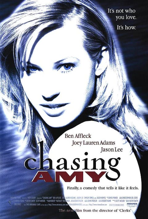 Chasing Amy — which I unabashedly stan — is far deeper, far more complex than its logline. If you haven’t seen it, I urge you to (though be sure to steel yourself for a bunch of edgy late 1990s humor, which can hit different a quarter of a century later, in more sensitive times). Despite the superficial premise, Chasing Amy is not a movie about how Ben Affleck’s dick is so great it can conquer lifelong lesbianism. In one read, Chasing Amy is actually a movie about how bi women construct our identities and navigate a monosexist dating sphere; in another, it’s a movie about how the unfathomably severe insecurity of straight men leads them to sabotage their own happiness. (I subscribe to both of these reads.) While I wouldn’t call it a queer movie, or praise it for any kind of accurate or nuanced depiction of queer life, I do think it’s a brilliant analysis of the particular hell that bi women face when we are on the dating market — and an especially smart take on the simultaneous fetishization and disgust that straight men direct our way.