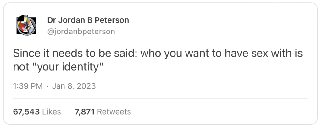 Over the weekend, Jordan Peterson — he of “clean your room” and lobster men fame — shared a tweet that I have to imagine he thought was a gonna be a real hard truth for queers to take.
