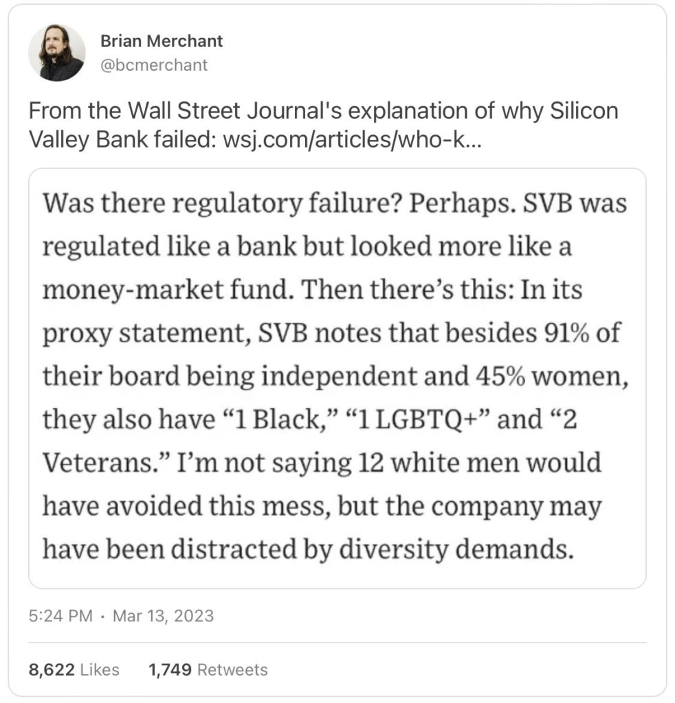 I don’t know how much attention you have been paying to the news about the collapse of Silicon Valley Bank (aka SVB, and don’t worry, you don’t need to know much about it for this essay) and I don’t know if you are a regular reader of the Wall Street Journal (I, myself, am not), but the context for what I am about to say today is that the Wall Street Journal ran an opinion piece about the collapse of Silicon Valley Bank and my colleague Brian Merchant helpfully tweeted out a section of it that was, well, a lot!