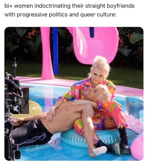 In theory, this is positive, no? It depicts bi women as Kate McKinnon! Who doesn’t want to be Kate McKinnon, let alone a Kate McKinnon who is being lovingly adored by Ryan Gosling? And the general vibe is clearly intended to be positive and affirming: bi women! We make our straight boyfriends better, and they love us for it!